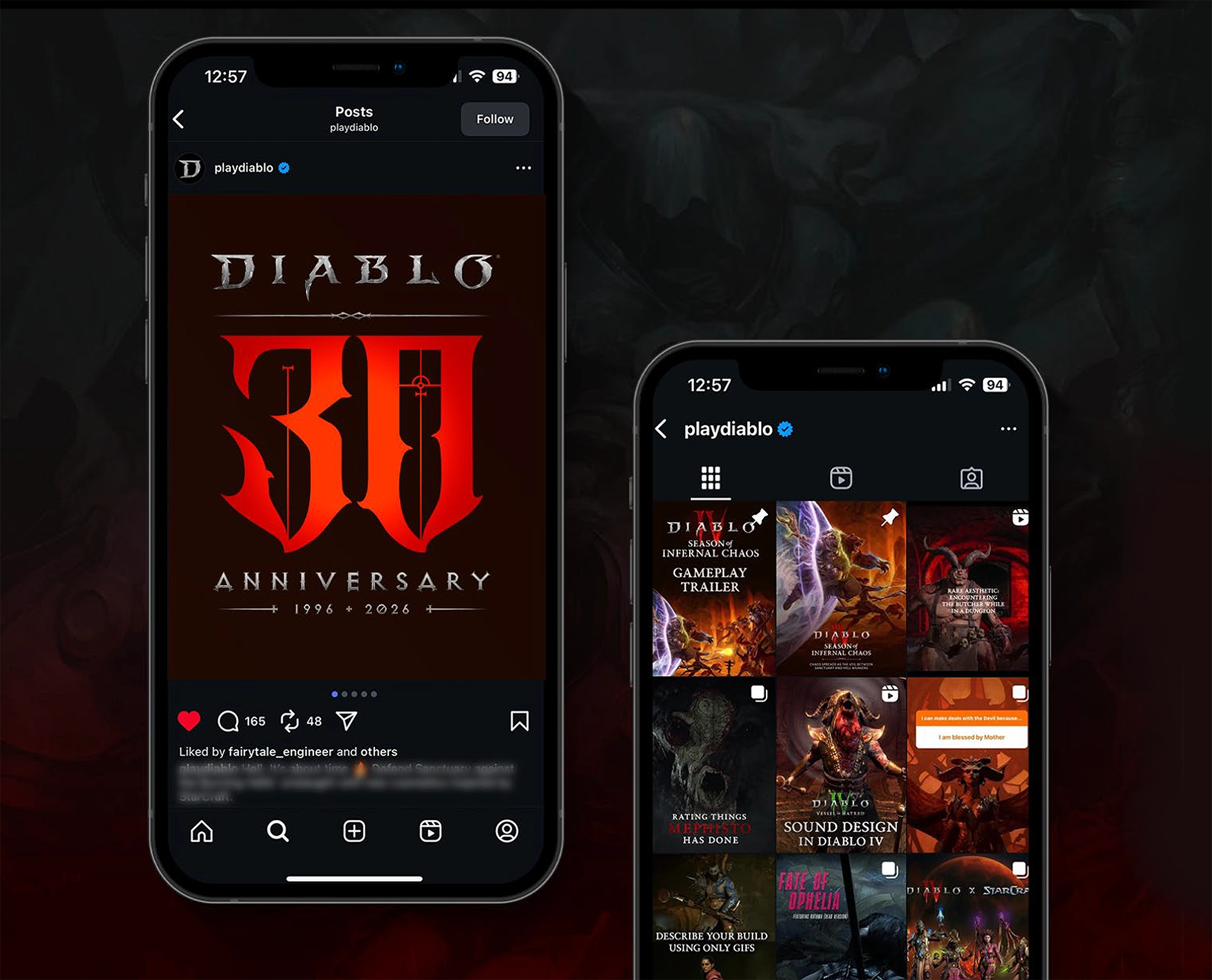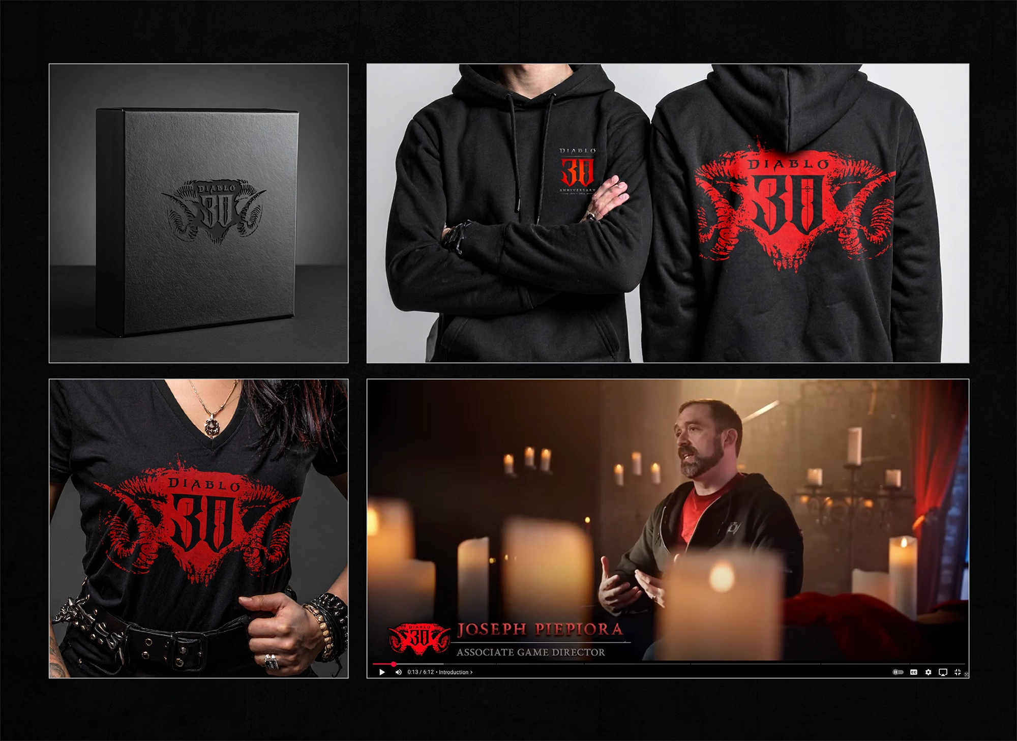 Created to honor three decades of darkness, legacy, and relentless combat, the Diablo 30th Anniversary logo stands as a tribute to one of gaming’s most iconic franchises. Drawing from the game's gothic roots and infernal mythology, we crafted a mark that feels both timeless and menacing – a symbol forged in fire for the universe that defined action RPG history. To further support this epic milestone, we delivered a robust brand style guide, motion, social media and merchandise.